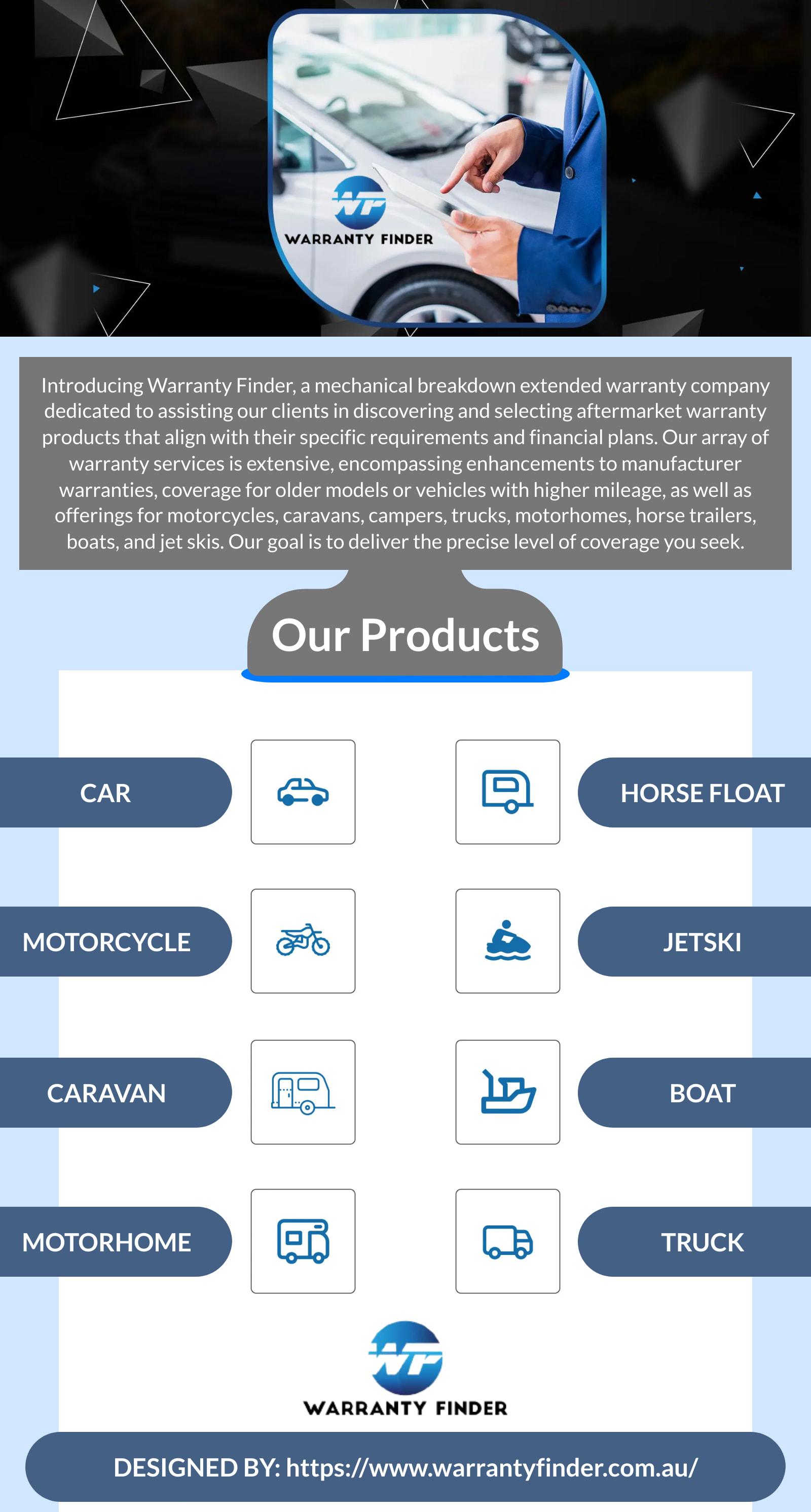 Introducing Warranty Finder, a mechanical breakdown extended warranty company dedicated to assisting our clients in discovering and selecting aftermarket warranty products that align with their specific requirements and financial plans. Our array of warranty services is extensive, encompassing enhancements to manufacturer warranties, coverage for older models or vehicles with higher mileage, as well as offerings for motorcycles, caravans, campers, trucks, motorhomes, horse trailers, boats, and jet skis. Our goal is to deliver the precise level of coverage you seek.