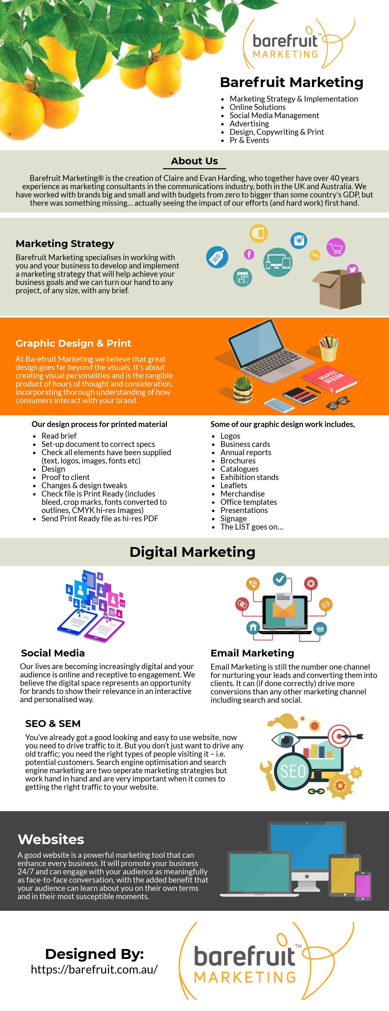 Barefruit Marketing is a full-service, creative marketing agency servicing the Northern Rivers, as well as national and international clients. Based in Ballina, Barefruit creates innovative campaigns and marketing solutions with measurable results. The team can work independently as a ‘marketing department’ for your brand, or alongside an existing marketing team on an ongoing or project basis. With a diverse team of individuals coming from international agencies, Barefruit has expertise across a wide range of marketing services, including marketing strategy, branding, advertising, graphic design, building and maintaining websites, digital marketing, PR, and event management.