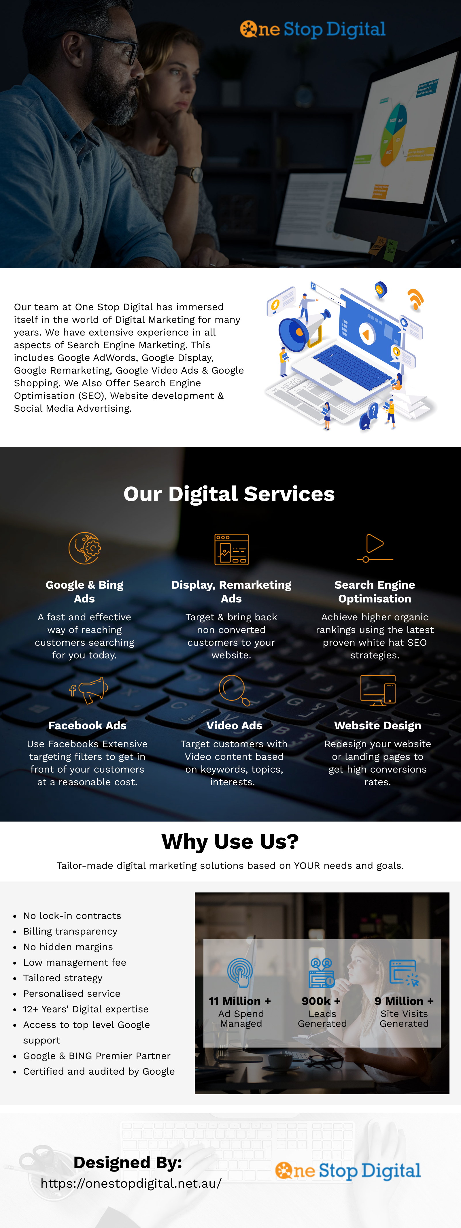 Tailor-made digital marketing solutions based on YOUR needs and goals. Our team at One Stop Digital has immersed itself in the world of Digital Marketing for many years. We have extensive experience in all aspects of Search Engine Marketing. This includes Google AdWords, Google Display, Google Remarketing, Google Video Ads & Google Shopping. We Also Offer Search Engine Optimisation (SEO), Website development & Social Media Advertising. We can provide premium quality, personally-tailored services in these fields.