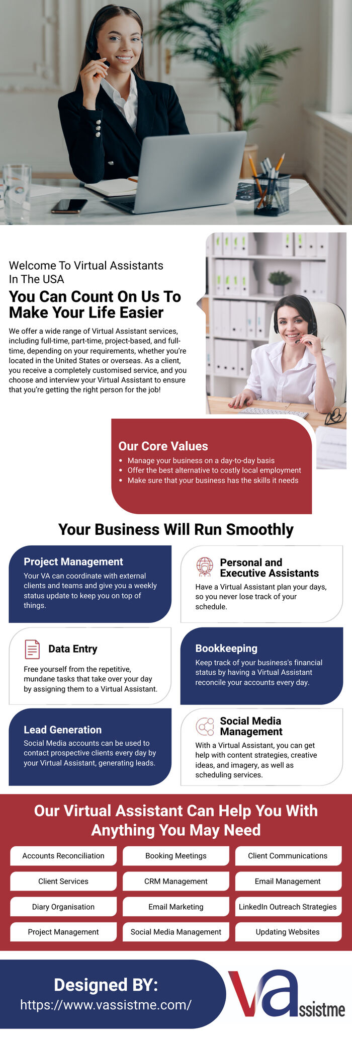 Virtual Assistant USA is in charge of offering business management professionals remote support. Conducting research and organizing data, engaging with clients or customers on behalf of their firm, and executing other secretarial activities such as updating calendars or sorting documents are all part of our responsibilities. VAssistme expert virtual assistants are adept at using technology and software tools. This enables them to carry out their job obligations from remote areas properly. They also have outstanding written and verbal communication skills, allowing them to compose professional documents and professionally converse with business customers.